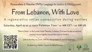 Permaculture & Palestine (PePa) @permaculturepalestine, Language for Justice and OGA @oga.web present this online call. 🎙️”Bilad el Sham”, or the